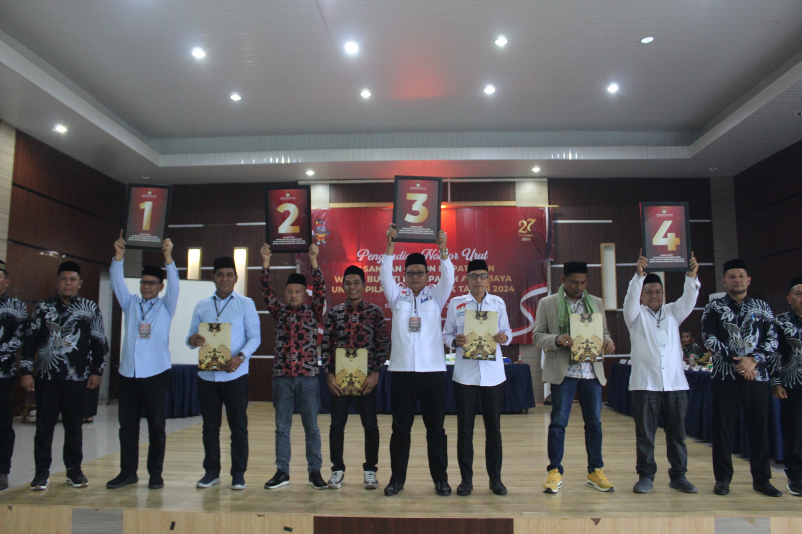 “Hasil pengundian nomor urut pasangan calon Bupati – Wakil dituangkan ke dalam berita acara tentang penetapan nomor urut pasangan calon peserta Pilkada Aceh tahun 2024 pemilihan Bupati,”kata Hendri Gunawan.