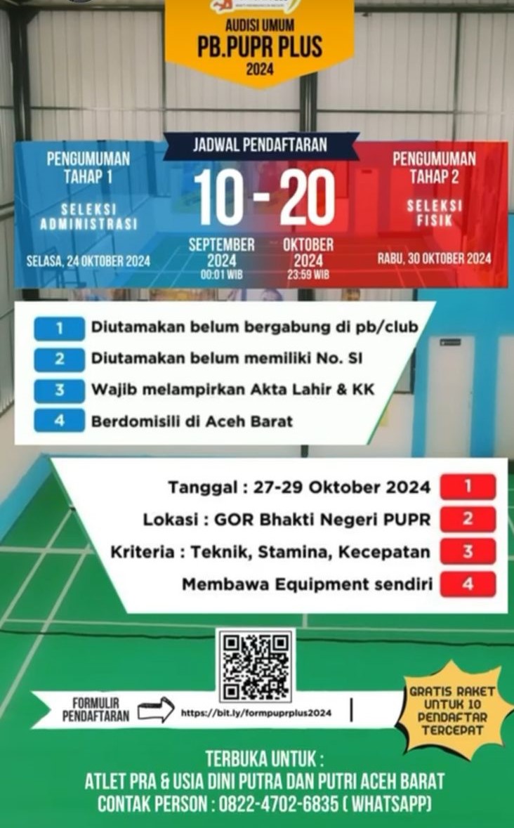 DISTORI.ID – Sejak dibukanya pendaftaran pada 10 September lalu, jumlah pendaftar calon atlet Persatuan Bulutangkis (PB) Pekerjaan Umum dan Penataan Ruang (PUPR) Aceh Barat sudah mencapai puluhan orang.