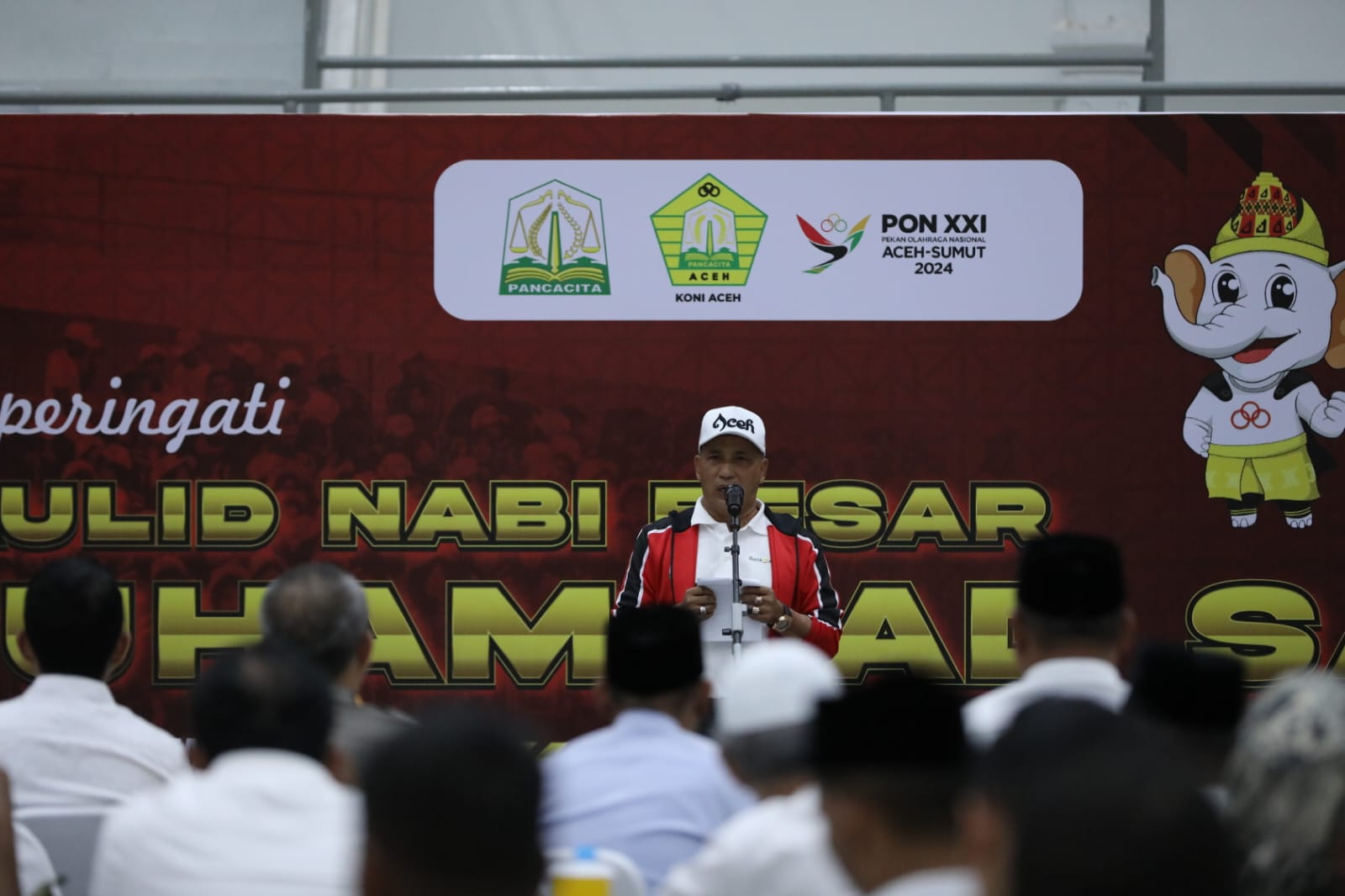Hal itu disampaikan Abu Razak—sapaan Kamaruddin Abu Bakar pada sambutannya di acara peringatan Maulid Nabi Muhammad SAW, sekaligus syukuran atas keberhasilan para atlet meraih prestasi di PON yang baru saja dihelat, Selasa 24 September 2024 di GOR KONI Aceh, Banda Aceh.