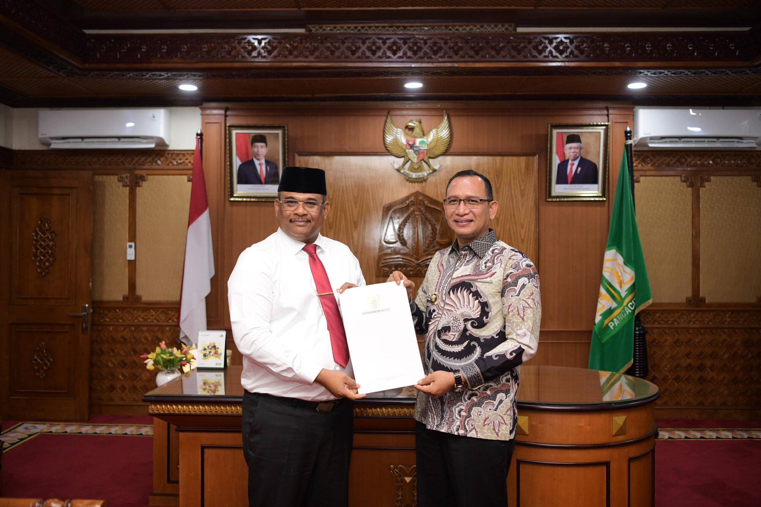 Prosesi penyerahan SK Perpanjangan masa Jabatan berlangsung di ruang kerja Gubernur Aceh, Jumat (27/9/2024) sore.