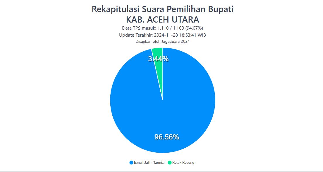 Berdasarkan rekapitulasi sementara, pasangan Jailil-Tarmizi mengantongi 96.56% suara, jauh mengungguli kotak kosong yang hanya dipilih oleh 3.44% warga Aceh Utara. Hasil ini dihimpun melalui situs https://jagasuara2024.org/ yang di-update pada Kamis (28/11/2024) sore.