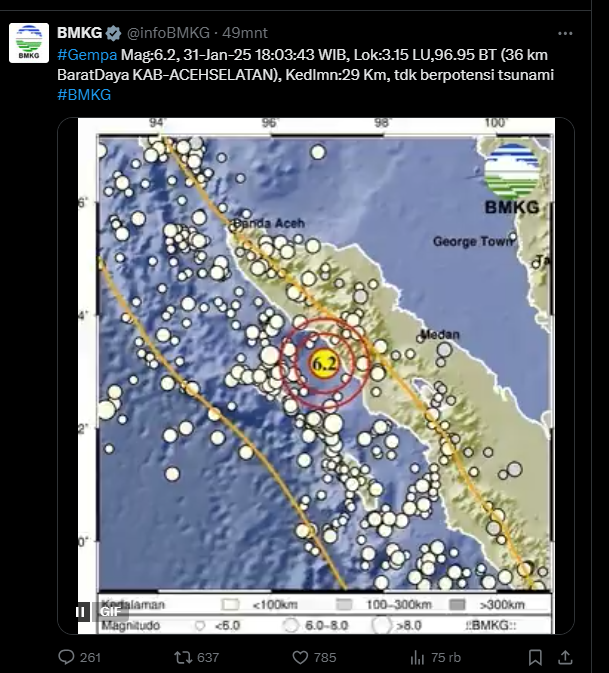 DISTORI.ID – Gempa bumi berkekuatan 6,2 magnitudo mengguncang wilayah Kabupaten Aceh Selatan dan sekitarnya pada Jumat (31/1/2025) pukul 18.03 WIB.