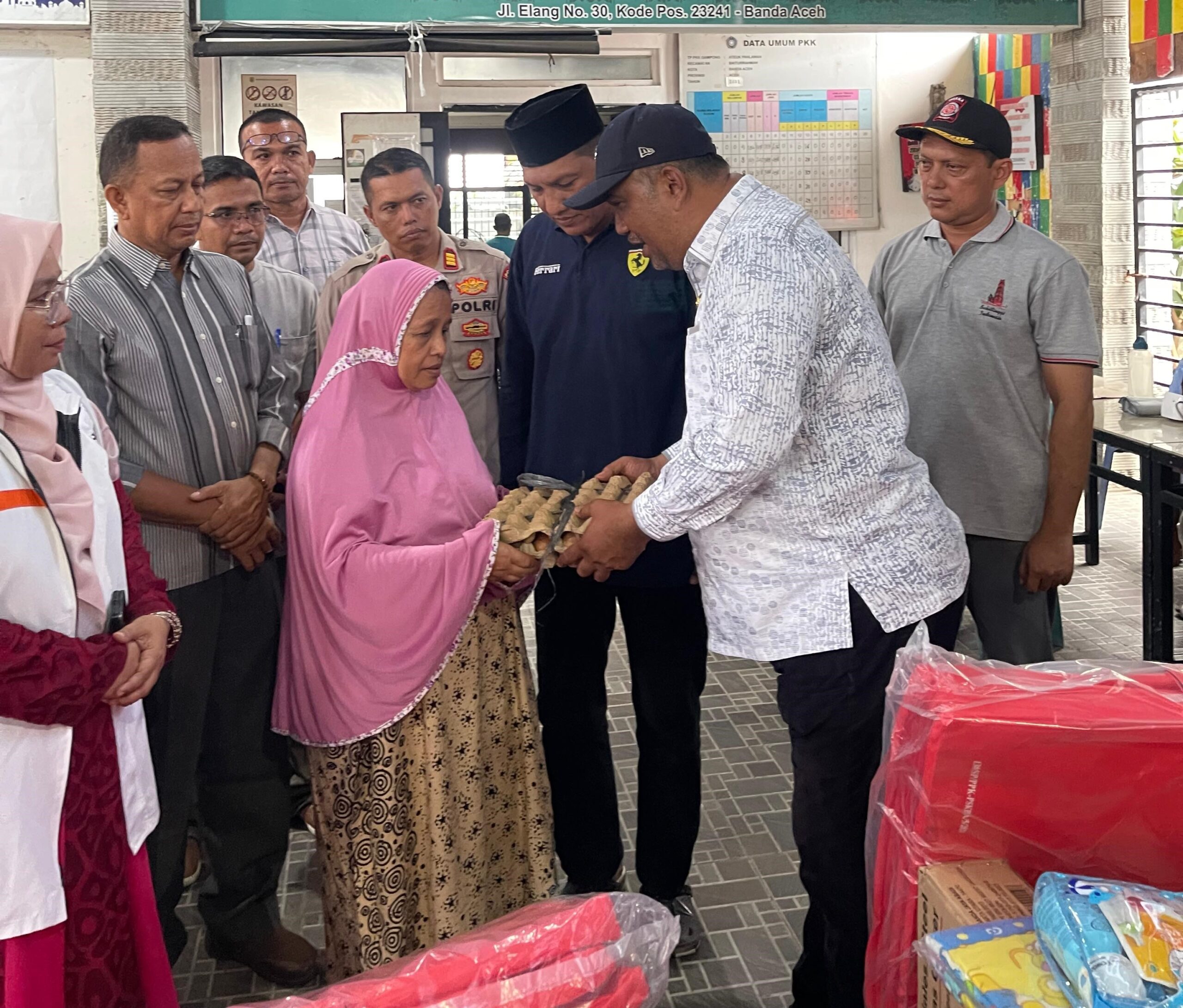 Penyerahan bantuan dilakukan di Kantor Keuchik Gampong Ateuk Pahlawan, yang dihadiri juga oleh berbagai unsur terkait.