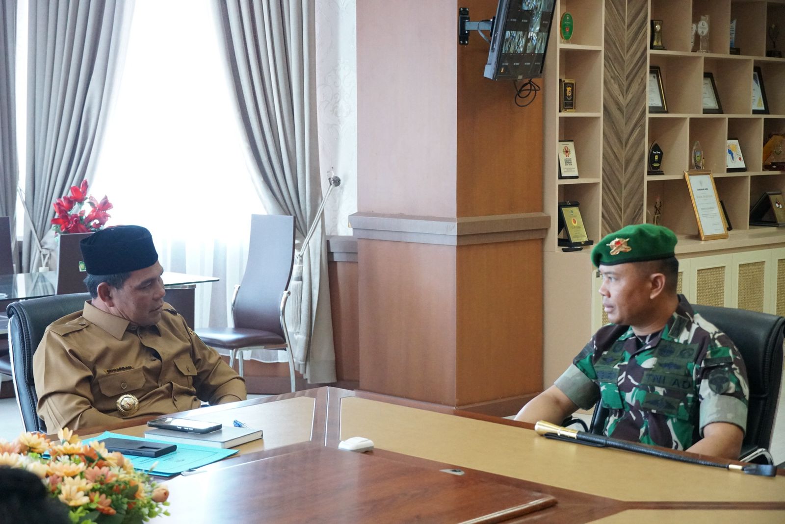 DISTORI.ID – Bupati Aceh Besar Muharram Idris menerima audiensi Komandan Yonif 117/Ksatria Yuda, Letkol Inf S.Kembaren SE MIP di ruang kerjanya, Kota Jantho, Senin (10/03/2025).