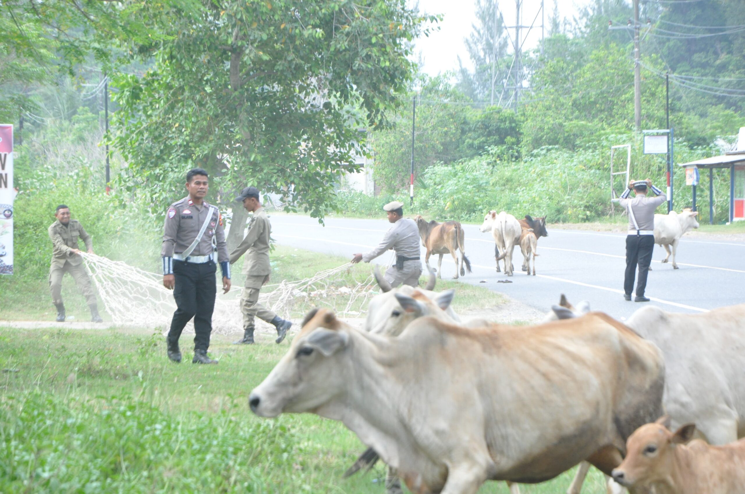 Satpol PP-WH Aceh Besar Tangkap Ternak yang Berkeliaran di Jalan Lintas Banda Aceh-Meulaboh