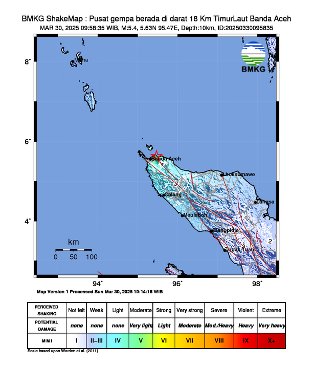 Peta gempa bumi berkekuatan 5,4 magnitudo mengguncang wilayah Aceh Besar dan sekitarnya pada Minggu (30/3/2025) pukul 09.58 WIB. (Foto: DISTORI/dok. BMKG)