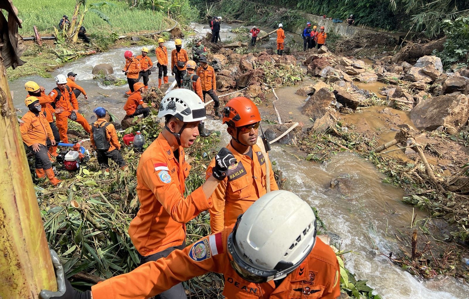 Sebuah unit alat berat ekskavator dikerahkan untuk mempercepat pembersihan material longsor, sementara Tim SAR gabungan fokus melakukan pencarian korban di area longsoran serta sepanjang jalur sungai.