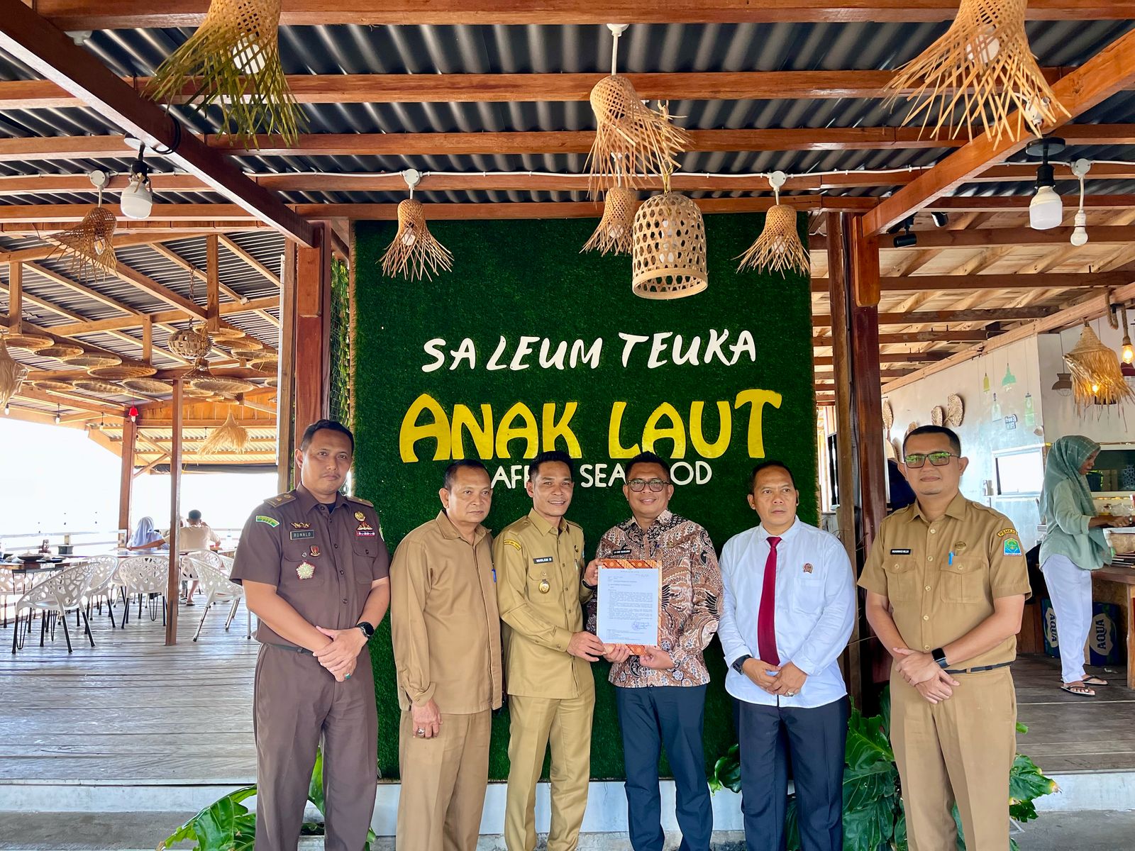 Dokumen penyerahan diserahkan langsung oleh Wakil Bupati Aceh Jaya, Muslem D, SE, kepada perwakilan Kementerian Transmigrasi usai jamuan makan siang di Resto Aneuk Laot, Calang, pada Selasa (15/4/2025).