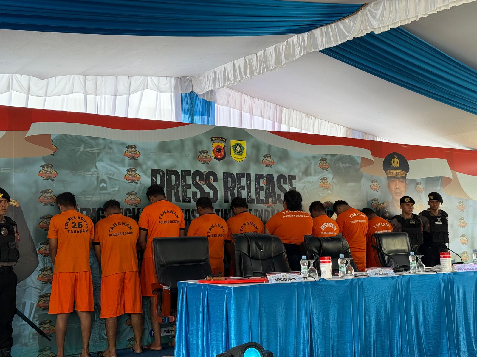 Konferensi pers digelar di halaman Mako Polres Bogor, Jalan Tegar Beriman, Cibinong, Jumat (9/5/2025). Barang bukti dihadirkan dalam konferensi pers tersebut.