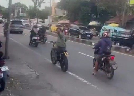 DISTORI.ID – Seorang pemuda di Kabupaten Maros, Sulawesi Selatan (Sulsel), mengacungkan jari tengah saat akan ditilang polisi lalu lintas karena tidak menggunakan helm dan kelengkapan kendaraan lainnya..