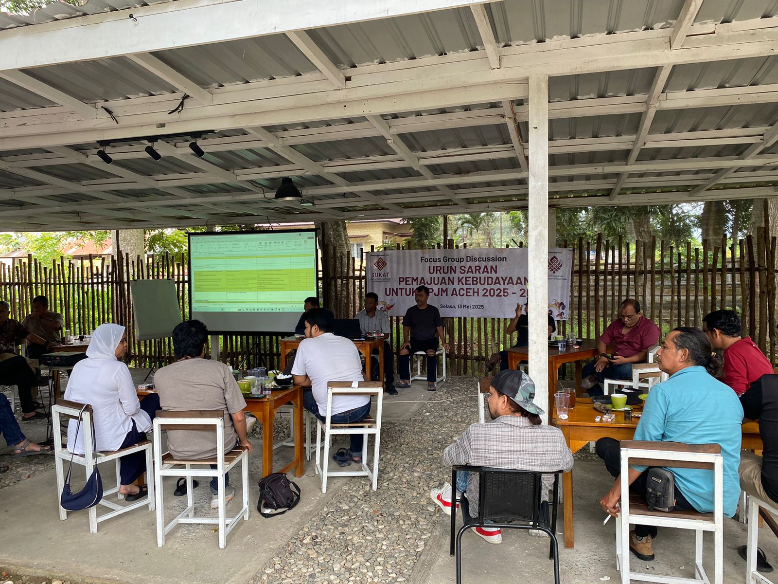 FGD ini dihadiri oleh fasilitator Duek Pakat Kebudayaan Aceh yang dilaksanakan oleh SUKAT beberapa waktu lalu dan tim yang tergabung dalam RPJM Aceh di Escape Green Bistro, Pango, Kecamatan Ulee Kareng, Banda Aceh, Selasa (13/5/2025).