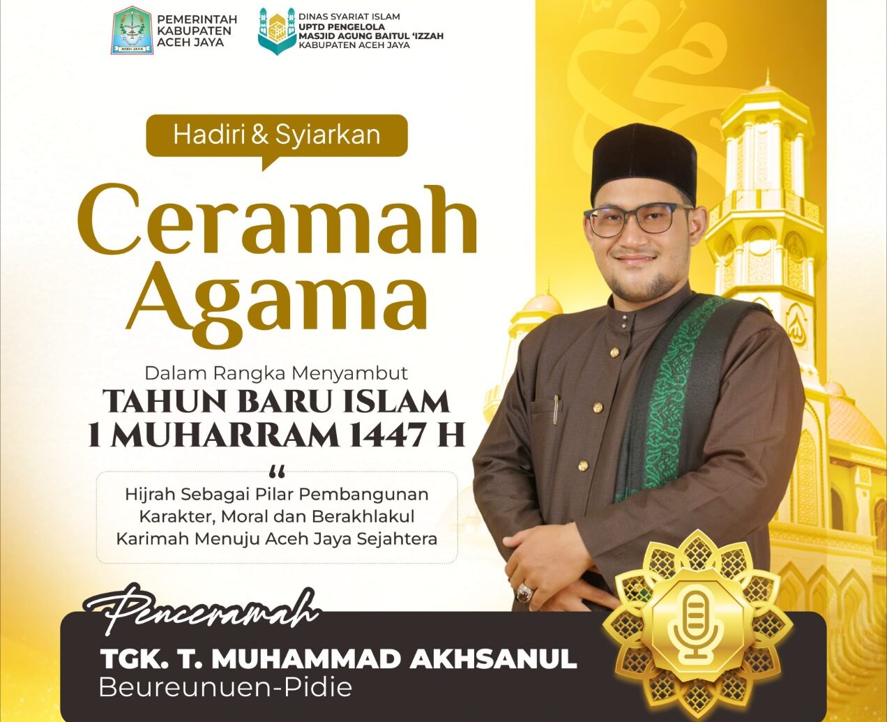 DISTORI.ID – Dalam rangka menyemarakkan peringatan Tahun Baru Islam 1 Muharram 1447 Hijriah, Pemerintah Kabupaten Aceh Jaya melalui Dinas Syariat Islam dan UPTD Pengelola Masjid Agung Baitul Izzah mengundang seluruh masyarakat untuk menghadiri ceramah agama yang akan digelar di Masjid Agung Baitul Izzah, Calang, Pada Kamis (26/6/2025) malam.