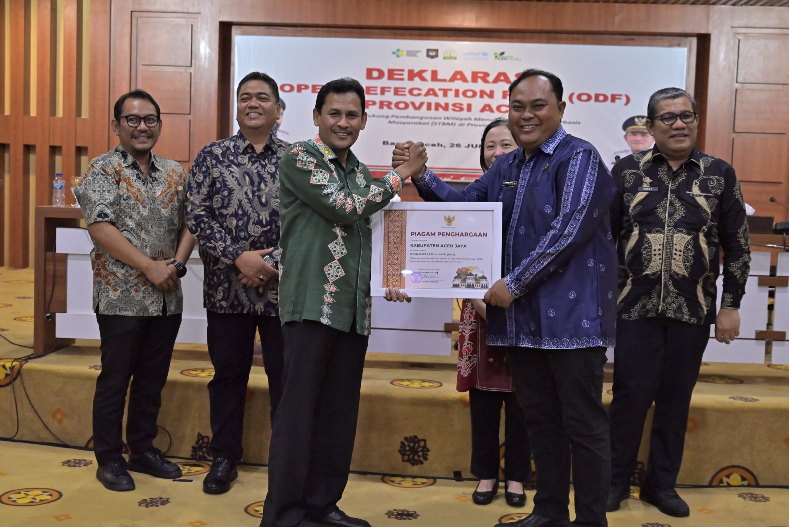 Penghargaan tersebut diserahkan oleh Gubernur Aceh yang diwakili oleh Asisten II kepada Sekretaris Daerah Aceh Jaya, Teuku Reza Fahlevi, yang hadir mewakili Bupati Aceh Jaya, Safwandi, dalam acara Deklarasi Stop Buang Air Besar Sembarangan se-Provinsi Aceh di Aula Lantai 2 Gedung Serba Guna, Kantor Gubernur Aceh, Banda Aceh, Kamis (26/6/2025).