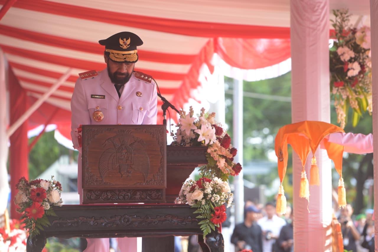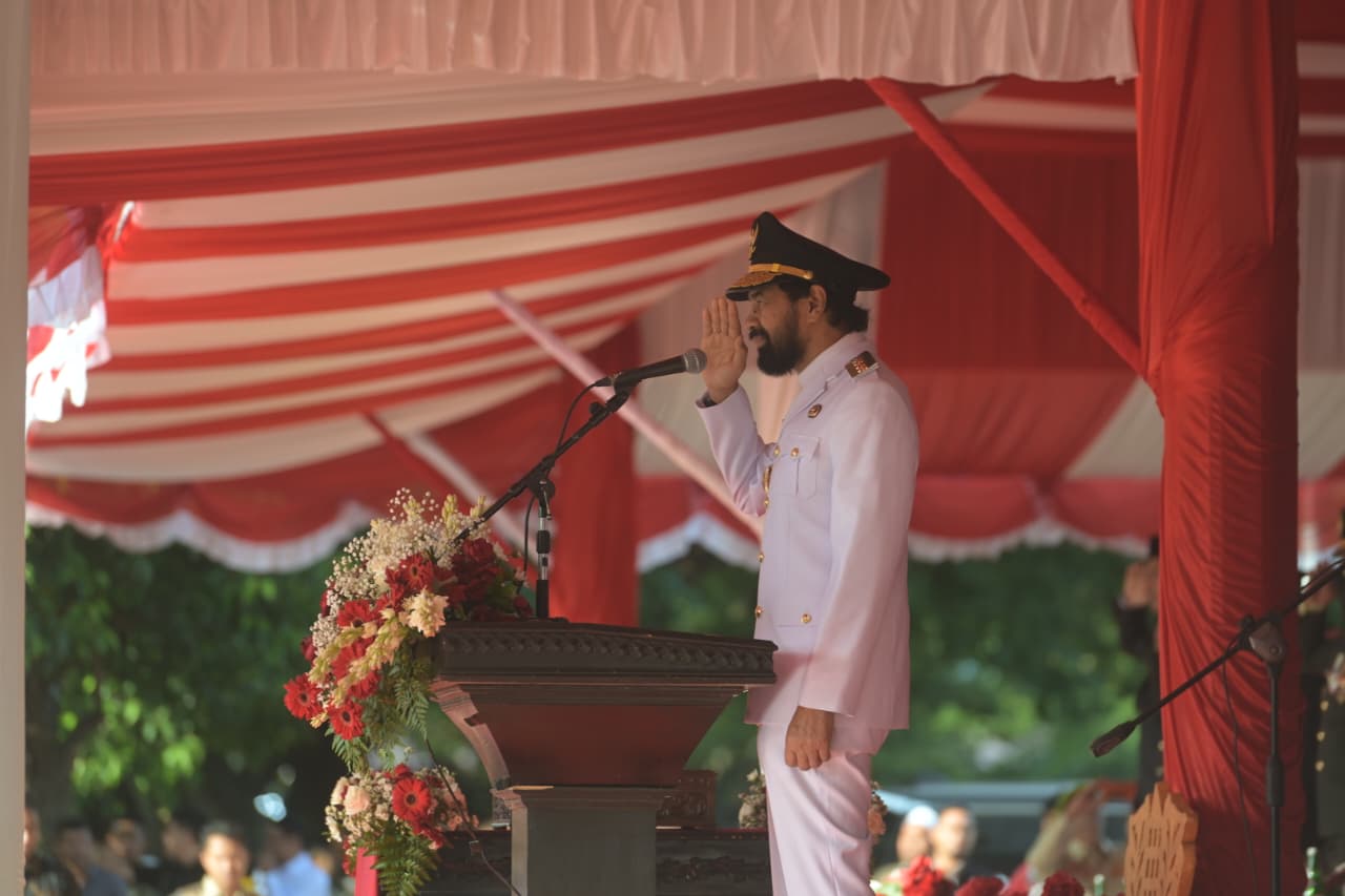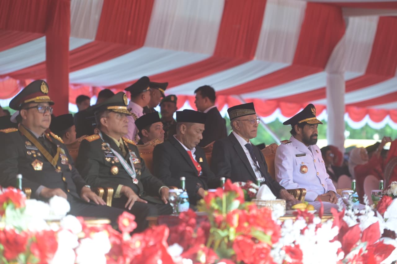 DISTORI.ID – Gubernur Aceh, Muzakir Manaf (Mualem), untuk pertama kalinya bertindak sebagai inspektur upacara peringatan HUT ke-80 Kemerdekaan RI di Lapangan Blang Padang, Banda Aceh, Minggu (17/8/2025). Upacara berlangsung khidmat dengan dihadiri jajaran Forkopimda, pejabat pemerintah, prajurit TNI-Polri, ASN, pelajar, hingga masyarakat umum. Gubernur didampingi oleh istrinya, Marlina Muzakir, sepanjang prosesi.