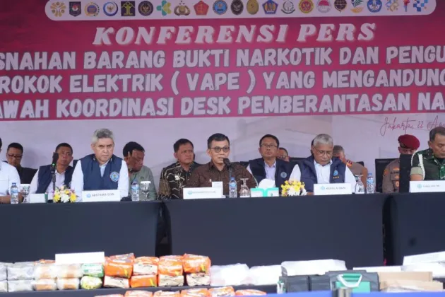 “Keberhasilan dalam pengungkapan kasus ini tentunya merupakan hasil kolaborasi yang intensif antara BNN dan instansi lainnya di bawah Desk Koordinasi Pemberantasan Narkoba yang merupakan bukti nyata komitmen kita dalam perang melawan narkoba di Indonesia,” ujar Menko Polkam Budi Gunawan, saat konferensi Pers Pemusnahan Barang Bukti Narkotika dan Pengungkapan Kasus Cairan Rokok Elektrik (Vape) yang Mengandung Narkoba di Jakarta, Jumat (22/8/2025).