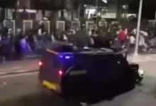 Dalam video yang beredar di media sosial, rantis Brimob tersebut melaju kencang di antara massa yang berhamburan di jalan.