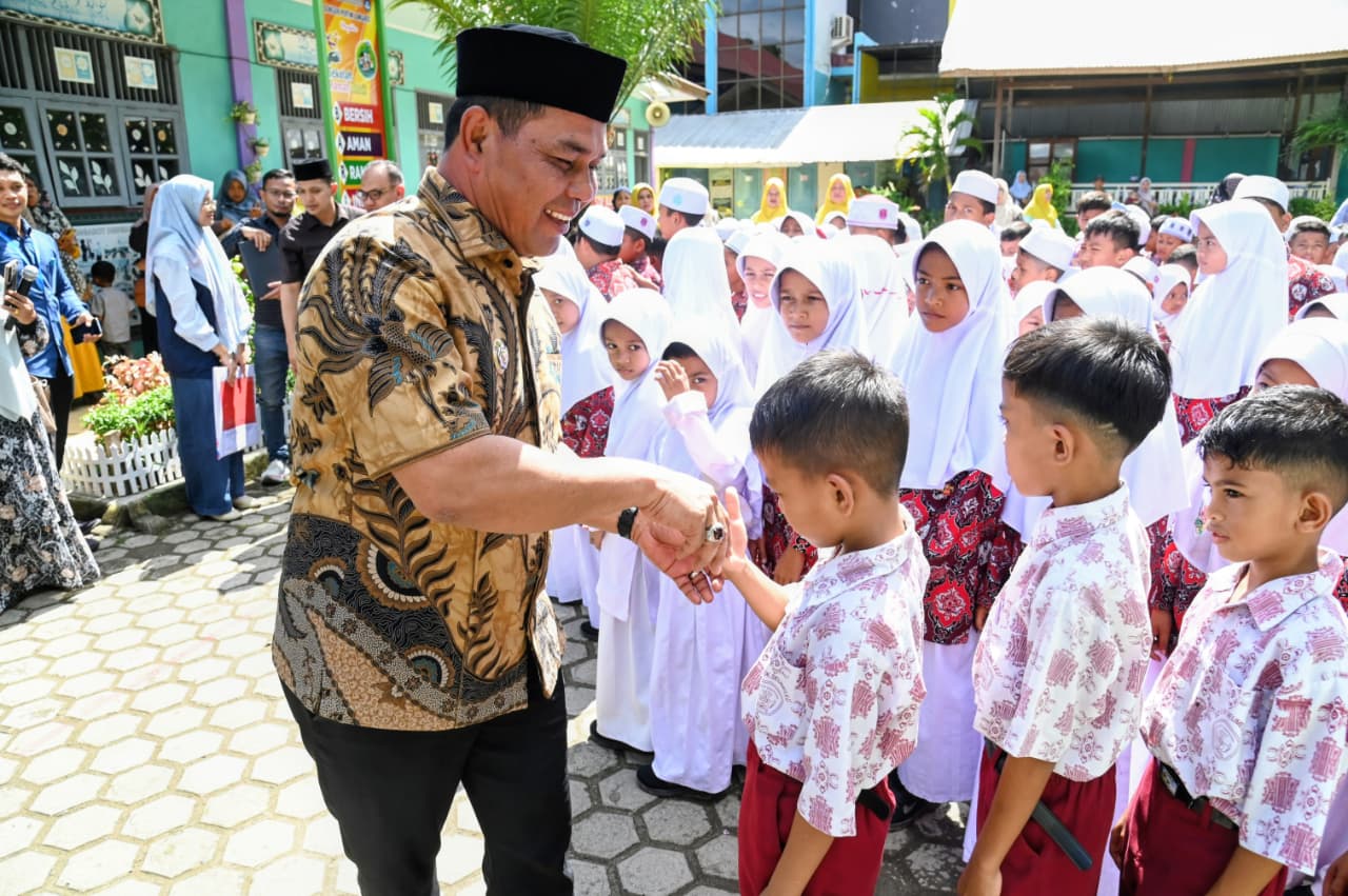 DISTORI.ID – Bupati Aceh Besar, Muharram Idris (Syech Muharram), bersama Pimpinan BRI Kantor Fungsional Banda Aceh Irwan, menyerahkan sebanyak 500 tas sekolah beserta perlengkapan alat tulis kepada para siswa, di SD Negeri Pertiwi Lamgarot, Kecamatan Ingin Jaya, Kabupaten Aceh Besar, Kamis (11/9/2025).