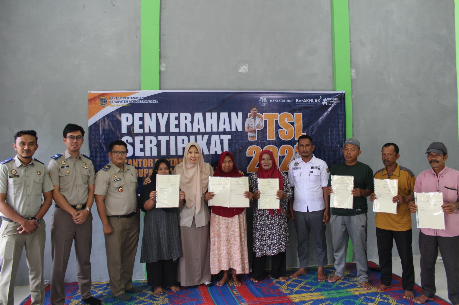 DISTORI.ID – Kantor Badan Pertanahan Nasional (BPN) Aceh Barat Daya (Abdya), menyerahkan sertipikat tanah kepada puluhan warga penerima manfaat Program Pendaftaran Tanah Sistematis Lengkap (PTSL) 2025 di Gampong Blang Padang, Kecamatan Tangan-Tangan, kabupaten setempat, pada Rabu (24/9).