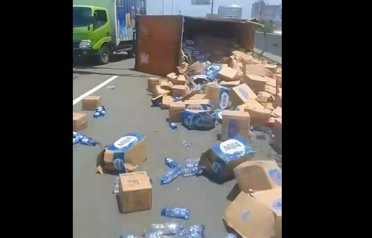 Dalam video berdurasi 32 detik tersebut, juga terlihat kardus-kardus berisi air mineral kemasan botol berhamburan di jalan.
