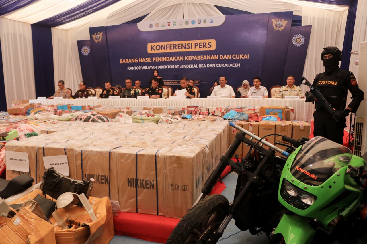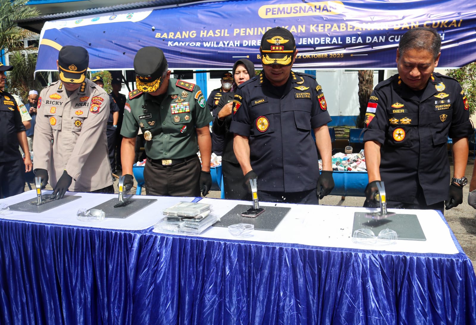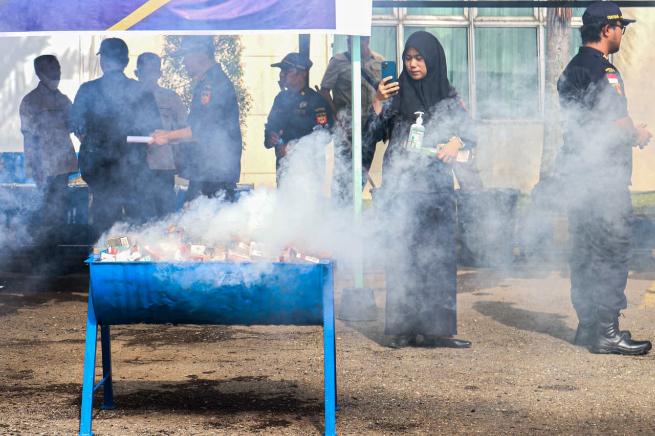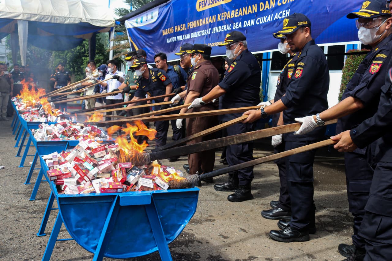 Kanwil Bea Cukai Aceh memusnahkan 6,3 juta rokok ilegal dan 21 unit ponsel iPhone di Kanwil Bea Cukai Aceh, Banda Aceh, Rabu (22/10/2025). Selain rokok dan iPhone, pihak Bea Cukai Aceh juga memusnahkan 34 pasang alas kaki, 16 koli pakaian bekas, 7 buah tas, 116 buah kosmetik, 2.314 buah obat-obatan, 7 kilogram pestisida, 100 bungkus kopi, dan 17,5 kilogram produk makanan. Barang-barang tersebut merupakan hasil dari 33 penindakan periode Desember 2023 hingga April 2025 dengan perkiraan nilai Rp139 juta.