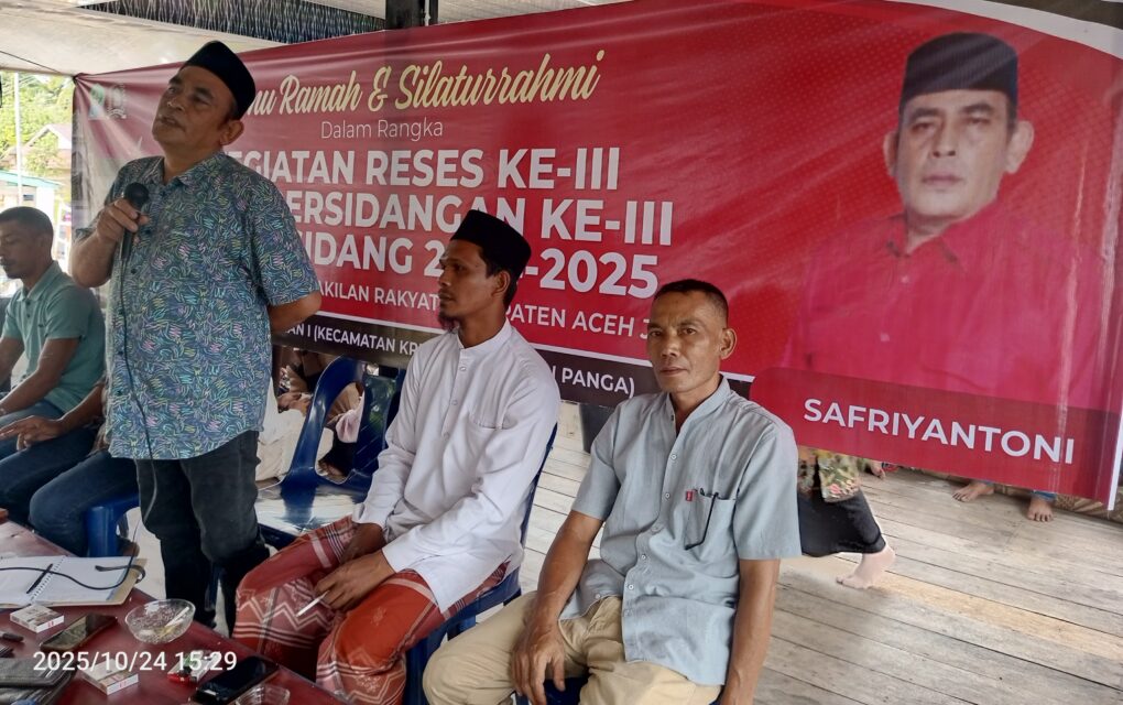 DISTORI.ID – Anggota Dewan Perwakilan Rakyat Kabupaten (DPRK) Aceh Jaya dari Fraksi Partai Aceh, Safriantoni, melaksanakan kegiatan Reses ke-III tahun 2025 bersama masyarakat di Desa Paya Seumantok, Kecamatan Krueng Sabee, Kabupaten Aceh Jaya, Jumat (24/10/2025).