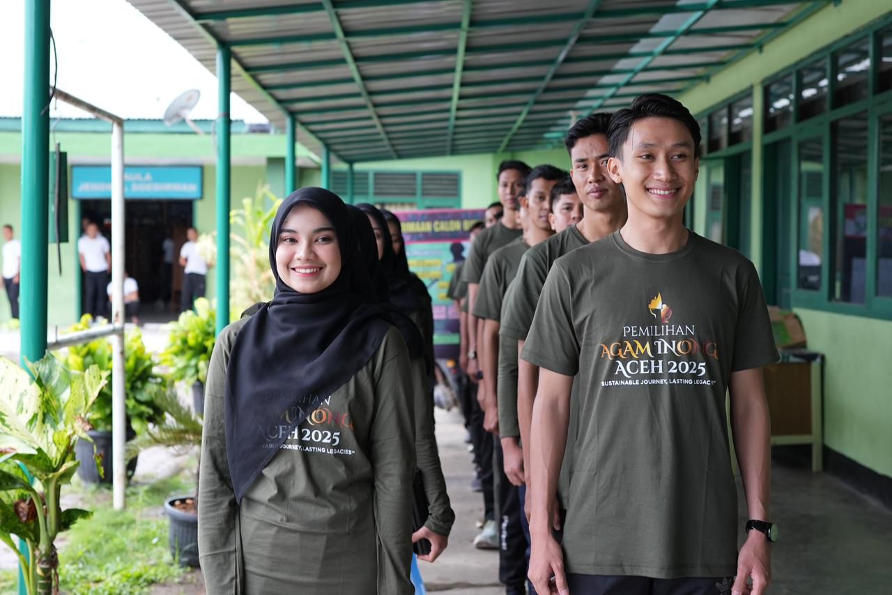Satu per satu mereka berbaris rapi di koridor hijau, mengenakan kaus bertuliskan Pemilihan Agam Inong Aceh 2025.