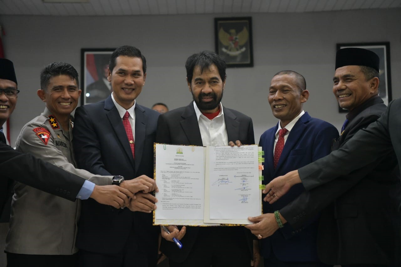 Prosesi penandatanganan turut disaksikan Kapolda Aceh Irjen Marzuki Ali Basyah, Sekda Aceh M. Nasir, para kepala SKPA, serta seluruh anggota DPRA.