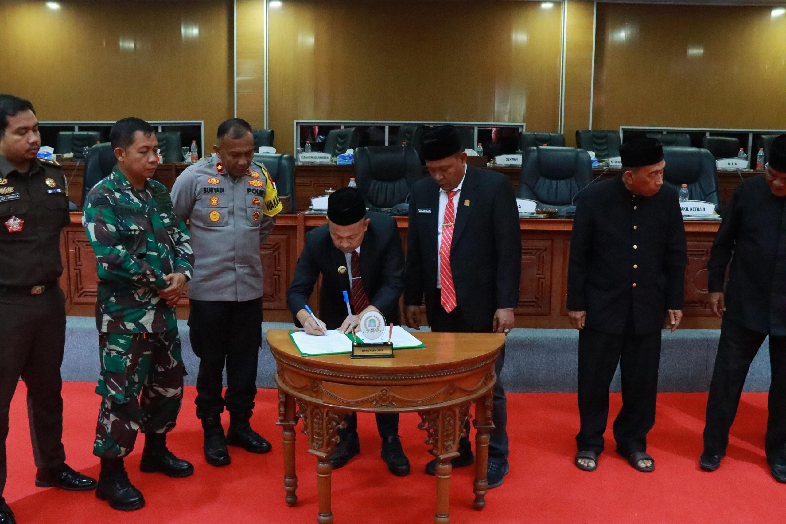 Pengesahan tersebut turut disaksikan Bupati Aceh Jaya, Safwandi, yang menyampaikan arah kebijakan daerah dan Nota Keuangan.