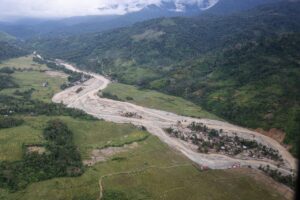 Sementara dari udara, ia menyaksikan sejumlah kampung yang hancur, bahkan sebagian rumah warga kini berada di tengah aliran sungai karena sungai yang meluas.