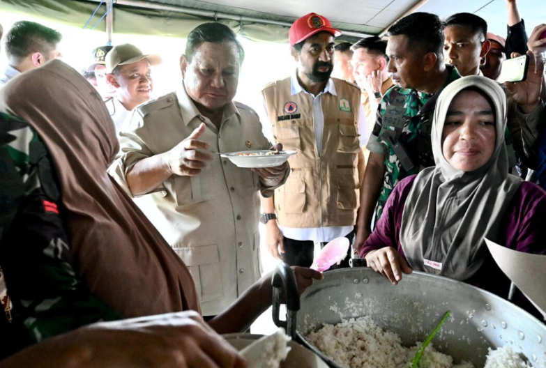 Presiden Prabowo kemudian bergerak menuju dapur umum untuk meninjau langsung persiapan distribusi pangan untuk pengungsi.