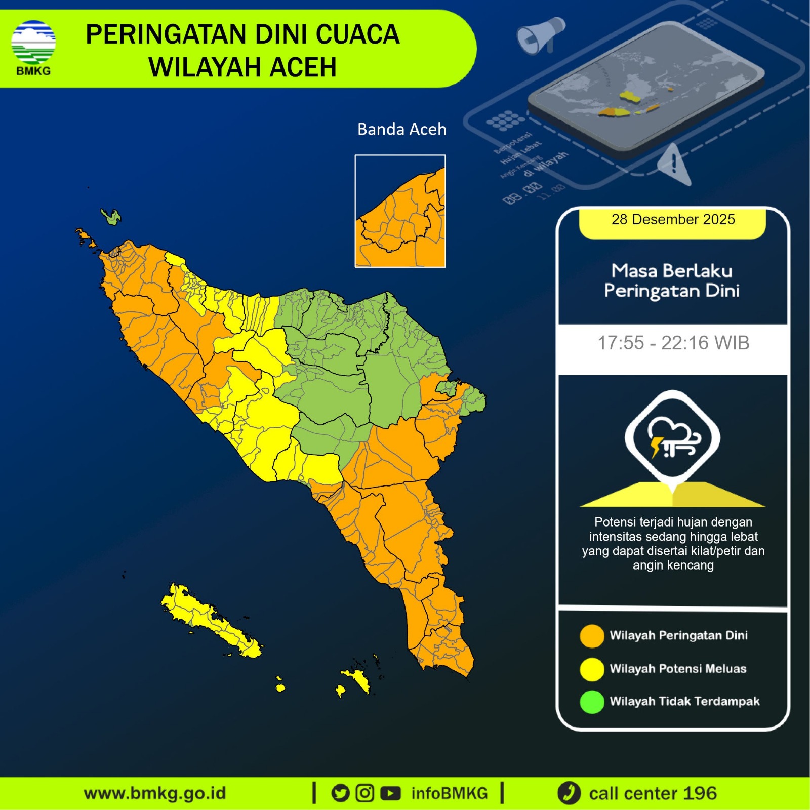 BMKG mencatat potensi hujan lebat terjadi antara lain di Kabupaten Aceh Selatan, Aceh Tenggara, Aceh Timur, Aceh Barat, Aceh Besar, Pidie, Aceh Singkil, Aceh Barat Daya, Gayo Lues, Aceh Jaya, Aceh Tamiang, serta Kota Banda Aceh dan Kota Subulussalam.