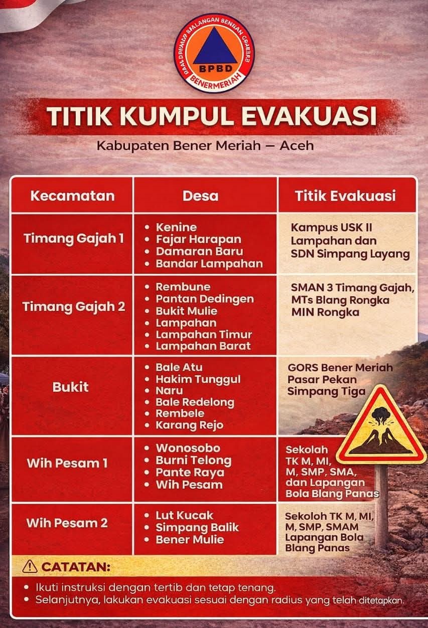 DISTORI.ID – Pemerintah Kabupaten Bener Meriah menetapkan sejumlah titik kumpul evakuasi bagi warga yang berada di wilayah rawan Gunung Api Bur Ni Telong, menyusul kenaikan status gunung tersebut ke Level III (Siaga). Masyarakat diminta tetap tenang dan mengikuti arahan petugas di lapangan.