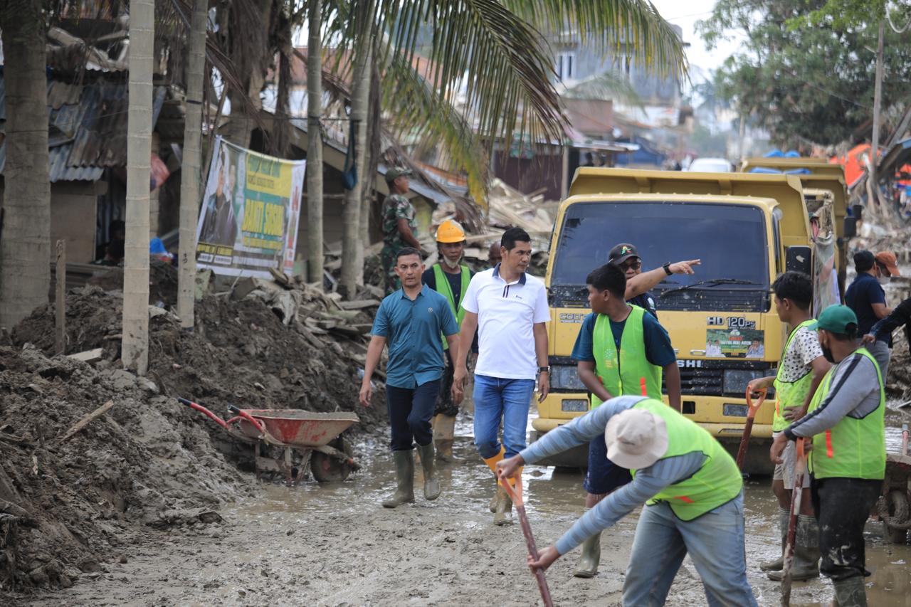 Sebagai langkah nyata, lima unit alat berat dikerahkan ke lokasi guna membersihkan material lumpur dan kayu gelondongan yang menimbun sejumlah fasilitas sekolah.