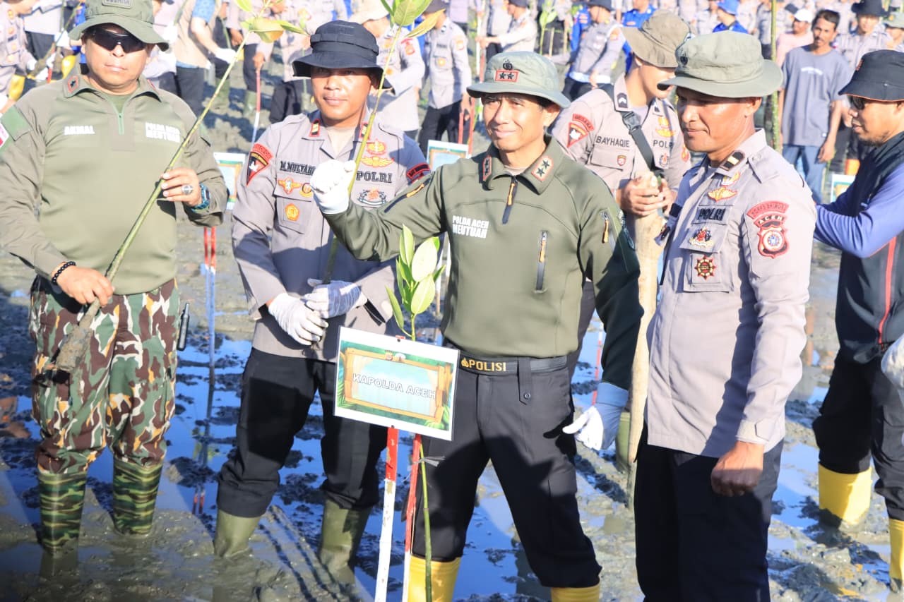 DISTORI.ID – Polda Aceh melaksanakan kegiatan penghijauan dengan menanam 10.000 bibit pohon mangrove di Desa Alue Naga, Kecamatan Syiah Kuala, Kota Banda Aceh, Jumat, 30 Januari 2026.
