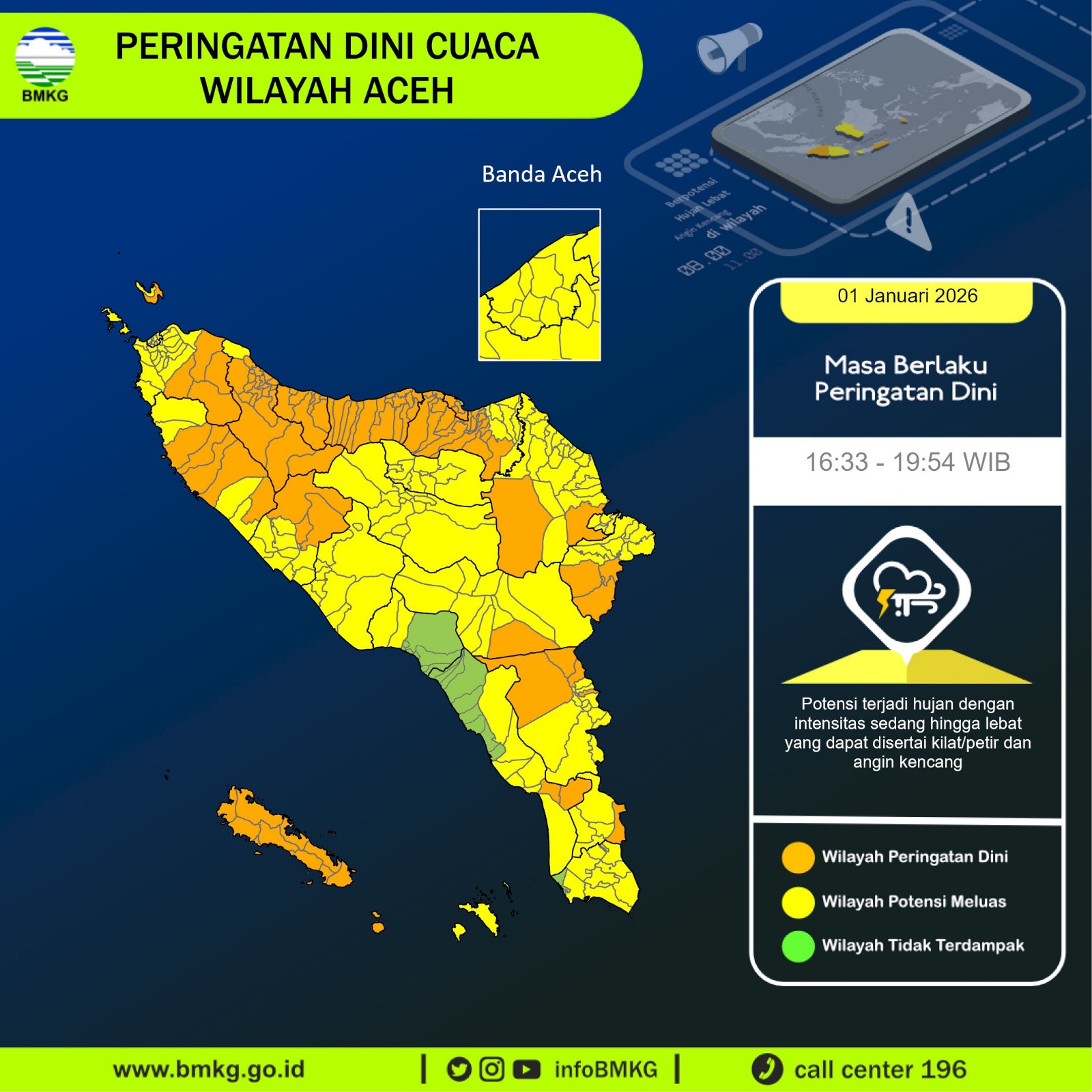 Berdasarkan pembaruan peringatan dini cuaca BMKG hari ini per pukul 16.23 WIB, potensi hujan lebat terjadi di Kabupaten Aceh Selatan, Aceh Tenggara, Aceh Timur, Aceh Barat, Aceh Besar, Pidie, Aceh Utara, Simeulue, Bireuen, Gayo Lues, Aceh Jaya, Aceh Tamiang, Pidie Jaya