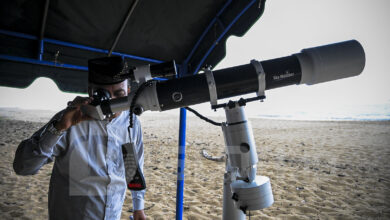 Petugas observatorium dari Dinas Syariat Islam Aceh Jaya memantau posisi hilal menggunakan teleskop astronomi dari pesisir pantai Lhokglumpang, di Desa…