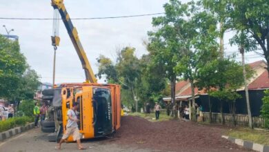 Truk Terguling di Simpang Dodik, Sawit Brondol Tumpah ke Jalan