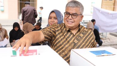 DISTORI.ID – Sekretaris Daerah (Sekda) Aceh, Bustami, bersama istrinya Mellani menggunakan hak suara di Pemilu 2024 di TPS 09 Masjid…